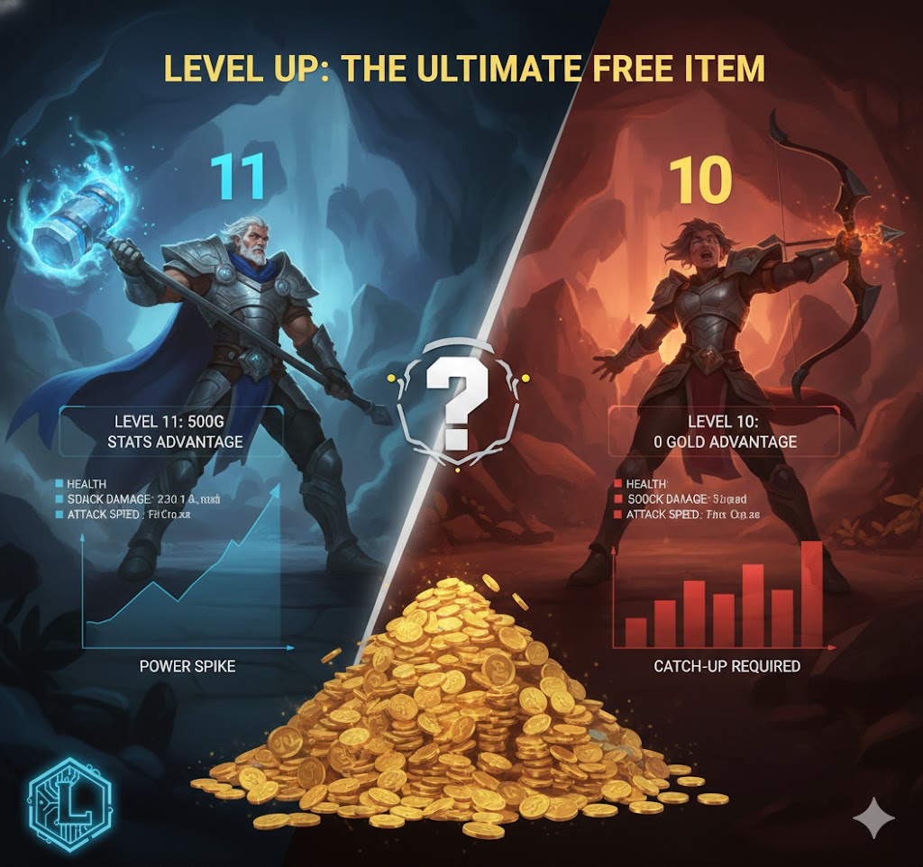 経験値は、ショップを通さずに手に入る 「最強の無料アイテム」 です。 CSを落とすこと以上に、「経験値の範囲外に追い出されること」の損失を恐れてください。1レベルの差を軽視するプレイヤーは、論理的に勝機を逃しています。